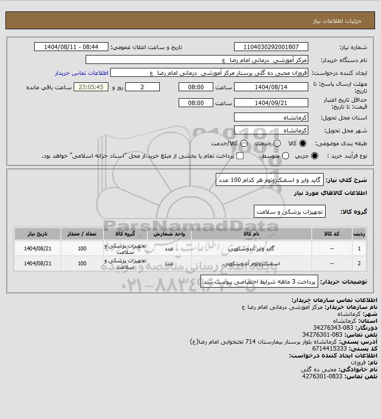 شرح کلی نیاز: گاید وایر و اسفنکتروتوم هر کدام 100 عدد