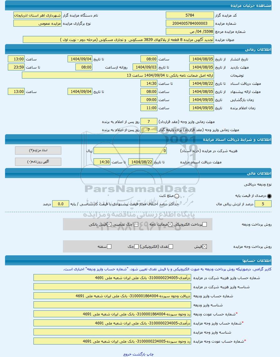 | شماره مال | 2104005784000022 | نوع برگزاری مزایده | مزایده عمومی | |