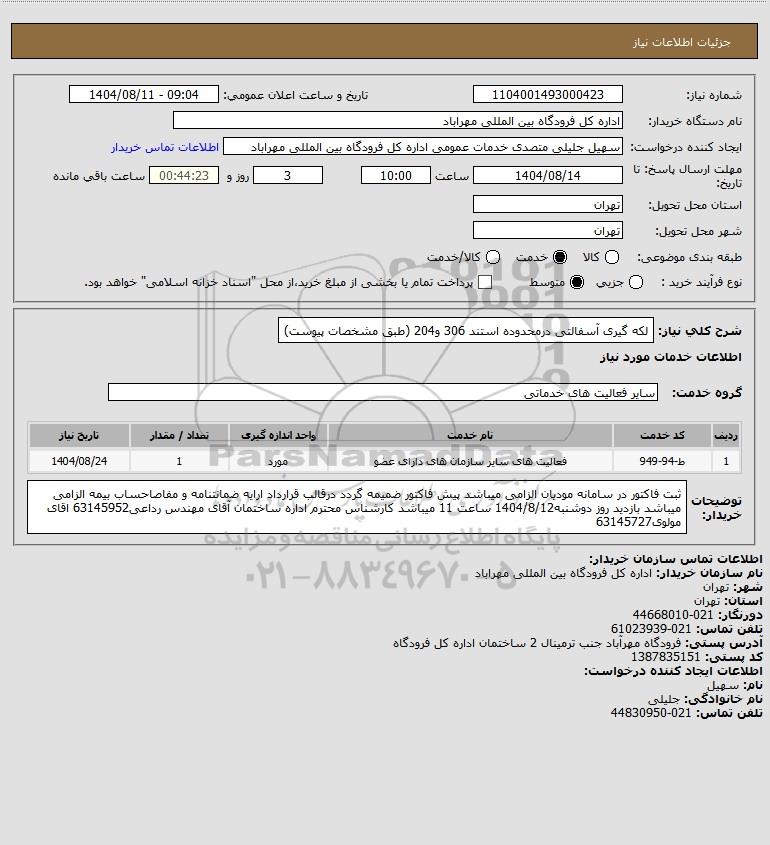 شرح کلی نیاز: لکه گیری آسفالتی درمحدوده استند 306 و204 (طبق مشخصات پیوست)