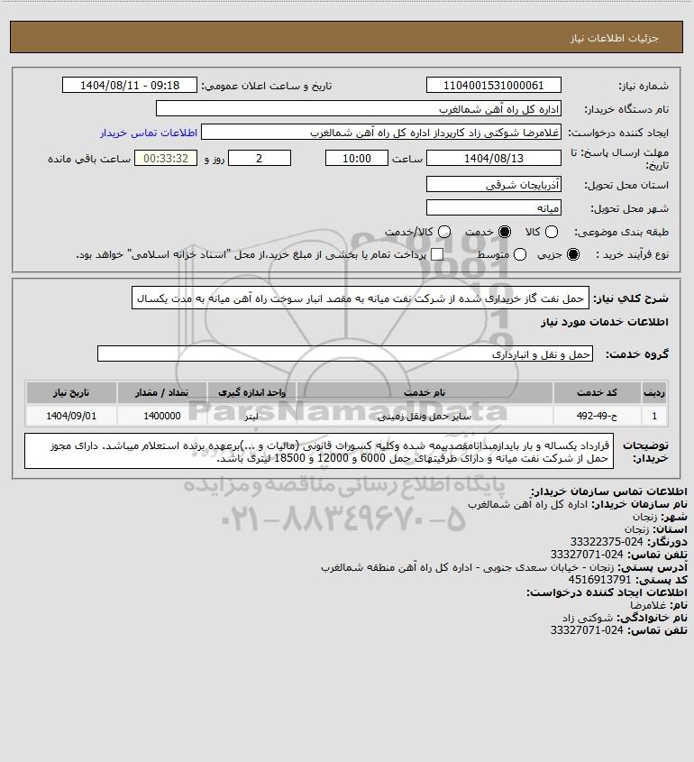 شرح کلی نیاز: حمل نفت گاز خریداری شده از شرکت نفت میانه به مقصد انبار سوخت راه آهن میانه به مدت یکسال