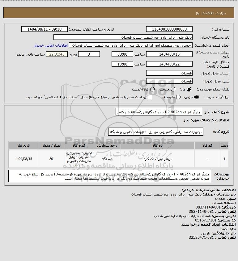 | 1 | -- | پرینتر لیزری تک کاره | دستگاه | تجهیزات مخابراتی، کامپیوتر، موبایل، ملزومات جانبی و شبکه | 30 | 1404/08/15 |