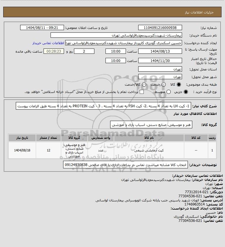 | 1 | -- | کیت آزمایشی شیمی | عدد | هنر و موسیقی، صنایع دستی، اسباب بازی و آموزشی | 12 | 1404/08/18 |