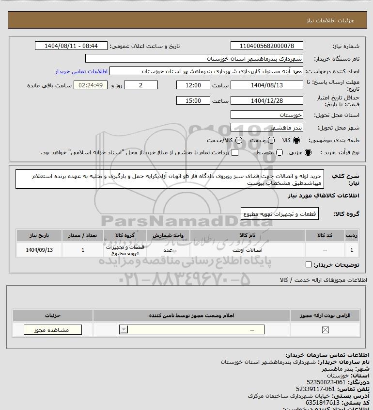 شرح کلی نیاز: خرید لوله و اتصالات جهت فضای سبز روبروی دادگاه فاز 6و اتوبان آزادیکرایه حمل و بارگیری و تخلیه به عهده برنده استعلام میباشدطبق مشخصات پیوست