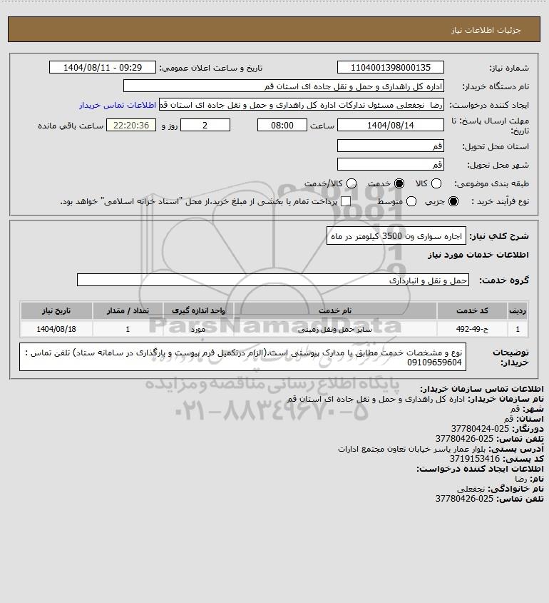شرح کلی نیاز: اجاره سواری ون 3500 کیلومتر در ماه
