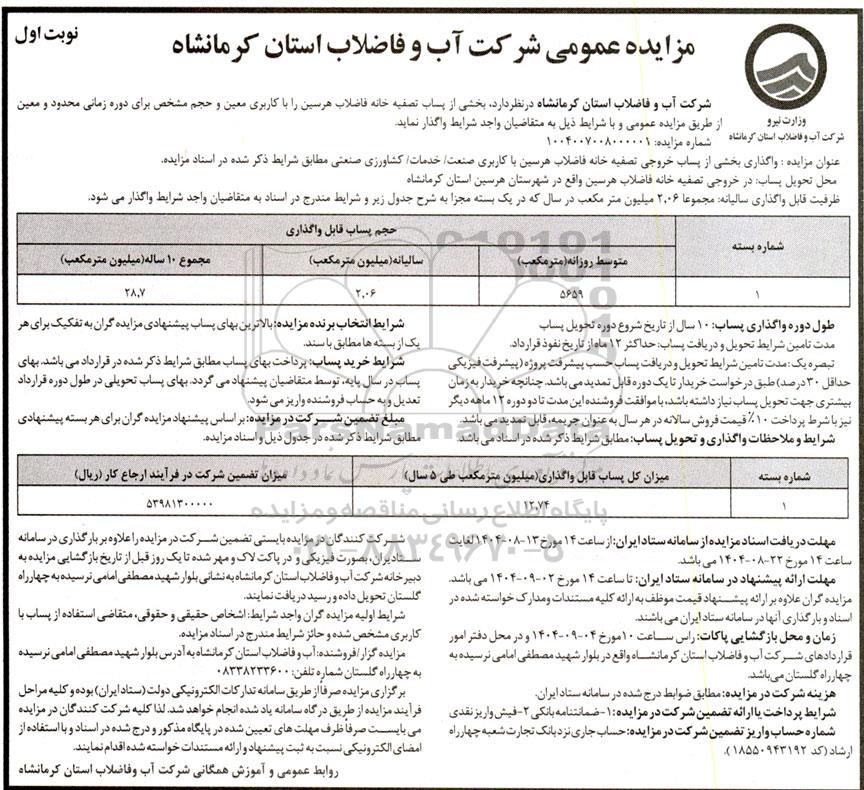 شرکت آب و فاضلاب استان کرمانشاه شرکت آب و فاضلاب استان کرمانشاه در نظر دارد بخشی از پساب تصفیه خانه فاضلاب هرسین را با کاربری معین و حجم مشخص برای دوره زمانی محدود و معین از طریق مزایده عمومی و با شرایط ذیل به متقاضیان واجد شرایط واگذار نماید.