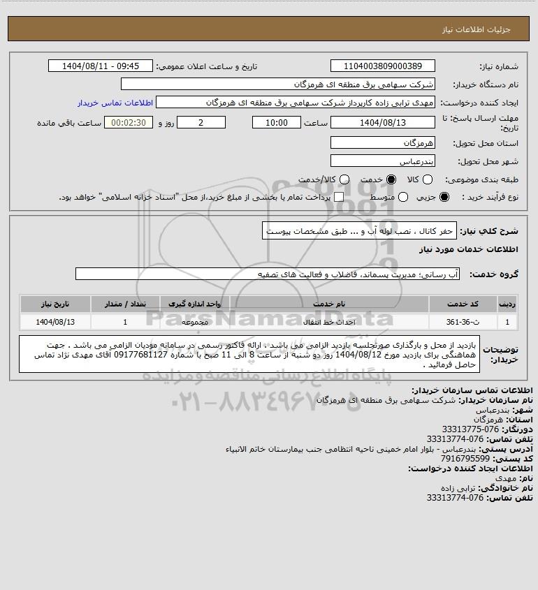 استعلام حفر کانال نصب لوله آب و ... طبق مشخصات پیوست, استعلام حفر کانال ، نصب لوله آب و ... طبق مشخصات پیوست