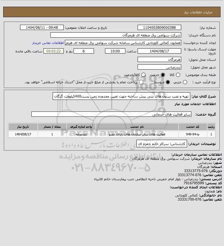 شرح کلی نیاز: تهیه و نصب ستون های بتنی پیش ساخته جهت تعیین محدوده زمین پست400کیلوولت گرگان