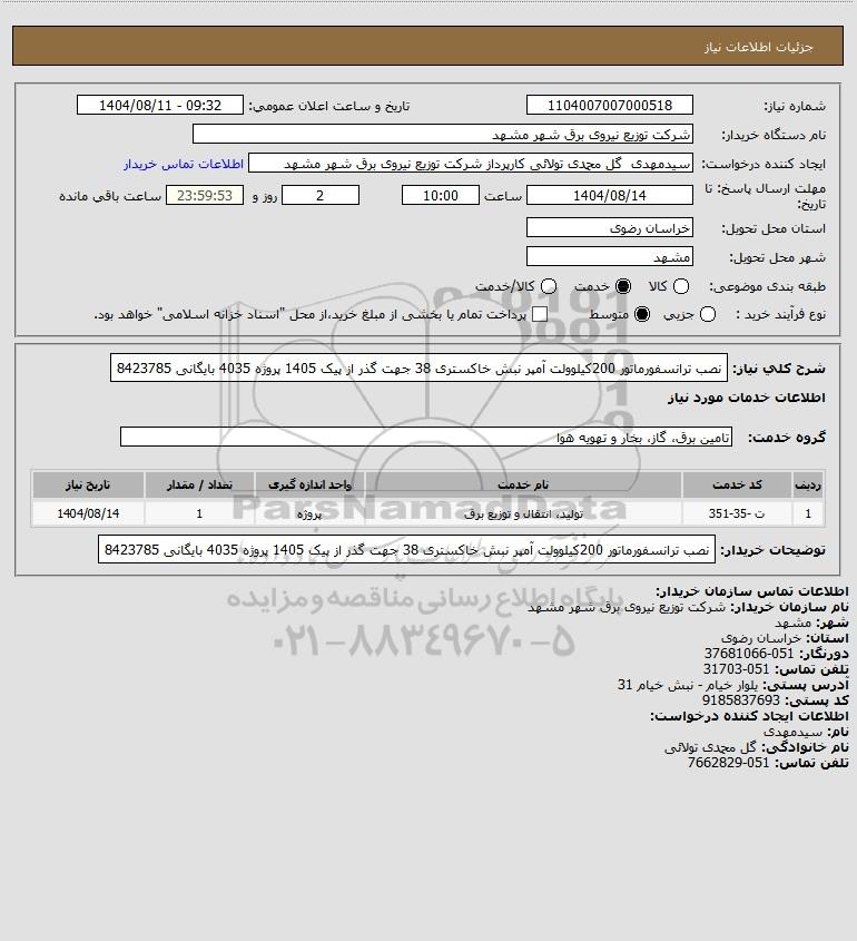 شرح کلی نیاز: نصب ترانسفورماتور 200کیلوولت آمپر نبش خاکستری 38 جهت گذر از پیک 1405 پروژه 4035 بایگانی 8423785