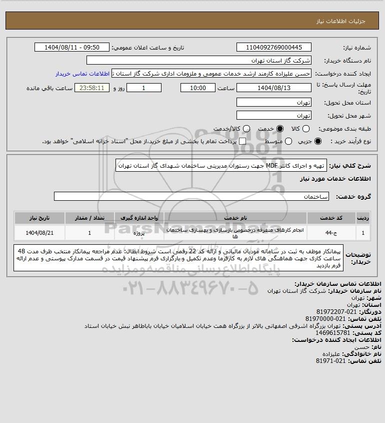 شرح کلی نیاز: تهیه و اجرای کانتر MDF جهت رستوران مدیریتی ساختمان شهدای گاز استان تهران
