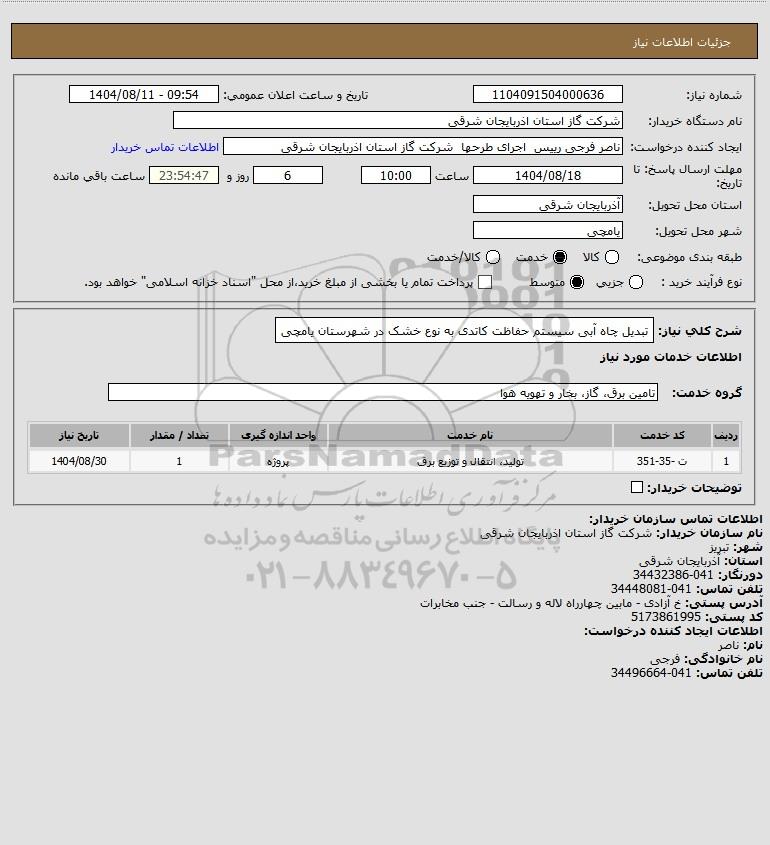 شرح کلی نیاز: تبدیل چاه آبی سیستم حفاظت کاتدی به نوع خشک در شهرستان یامچی