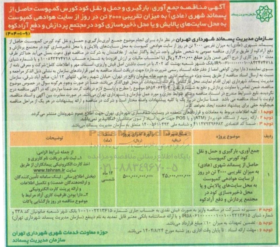 | جمع آوری، بارگیری و حمل و نقل کود کورس کمپوست حاصل از پسماند شهری (عادی) به میزان تقریبی 2000 تن در روز از سایت هوادهی کمپوست به محل سایتهای پالایش و یا محل ذخیره سازی کود در مجتمع پردازش و دفع آرادکوه | 25.000.000.000 | 500.000.000.000 | 12 ماه شمسی | از جمله شرایط الزامی: 1- ثبت نام ، دریافت نام کاربری و اخذ کارت الکترونیکی پیمانکاران از طریق سایت www.tehran.ir (بخش اطلاع رسانی: لینک سامانه تأمین کنندگان و ارائه دهندگان خدمت) و تکمیل اطلاعات و ارائه پرینت کارت الکترونیکی 2- دارا بودن ظرفیت کاری آزاد مرتبط با موضوع مناقصه در روز بازگشایی پاکات |