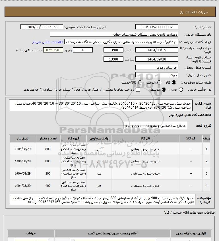 نام دستگاه خریدار:دهیاری کاریون بخش سنگان شهرستان خواف