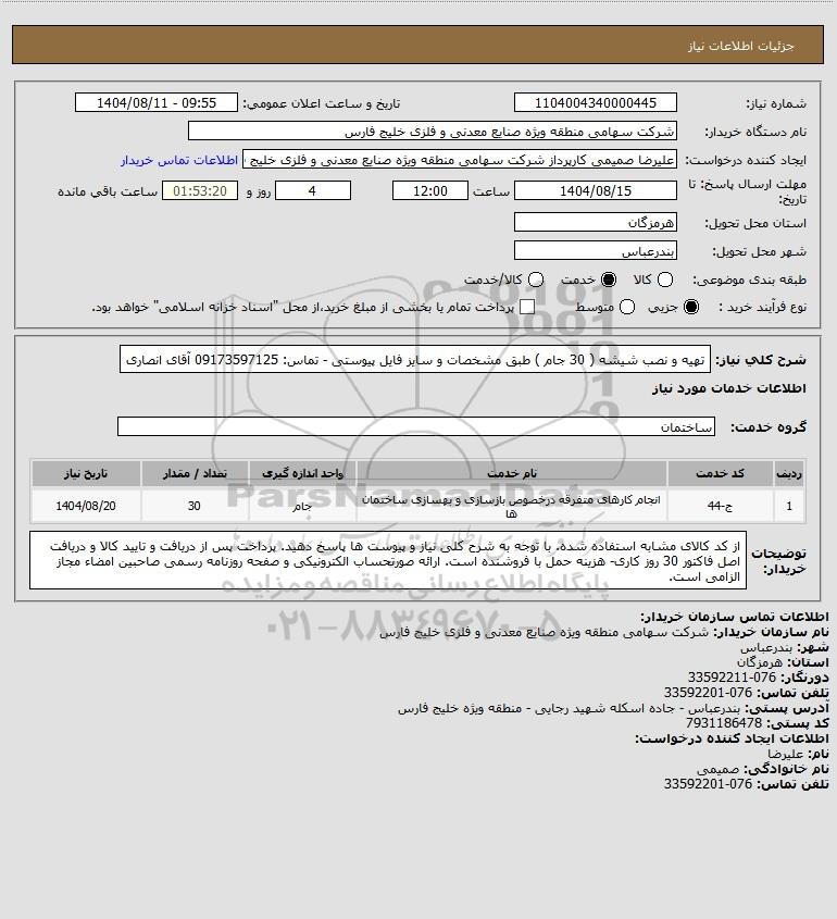شرح کلی نیاز: تهیه و نصب شیشه ( 30 جام ) طبق مشخصات و سایز فایل پیوستی - تماس: 09173597125 آقای انصاری