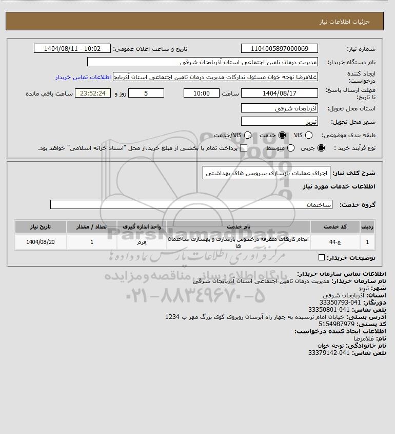 شرح کلی نیاز: اجرای عملیات بازسازی سرویس های بهداشتی