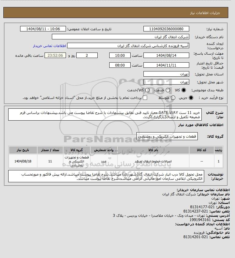 استعلام خرید 11 ست GATE WAY.معیار تایید فنی تطابق پیشنهادات با شرح تقاضا پیوست می باشد.پیشنهادات براساس فرم ضمیمه تکمیل و ارسال(بارگزاری)گردد., استعلام خرید 11 ست GATE WAY.معیار تایید فنی تطابق پیشنهادات با شرح تقاضا پیوست می باشد.پیشنهادات براساس فرم ضمیمه تکمیل و ارسال(بارگزاری)گردد.