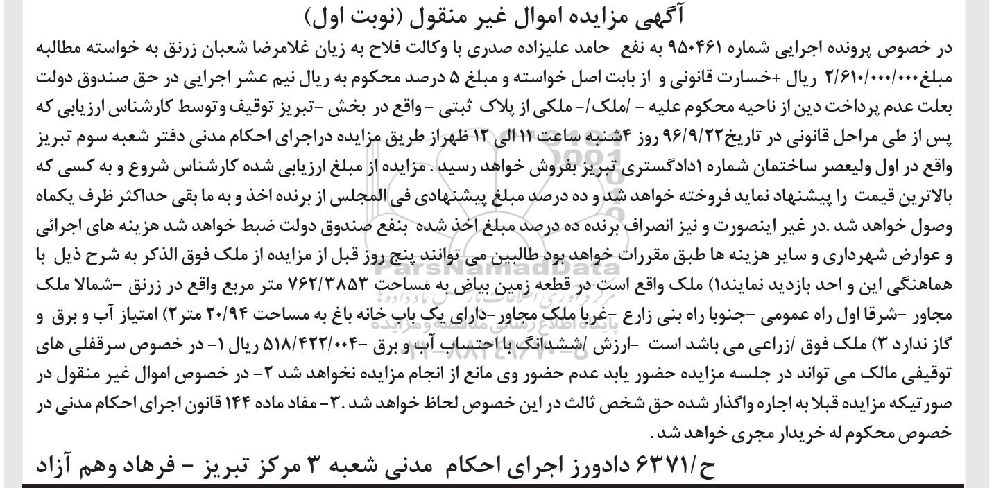 مزایده ملک در قطعه زمین بیاض مساحت 762.3853 متر کلاسه 950461