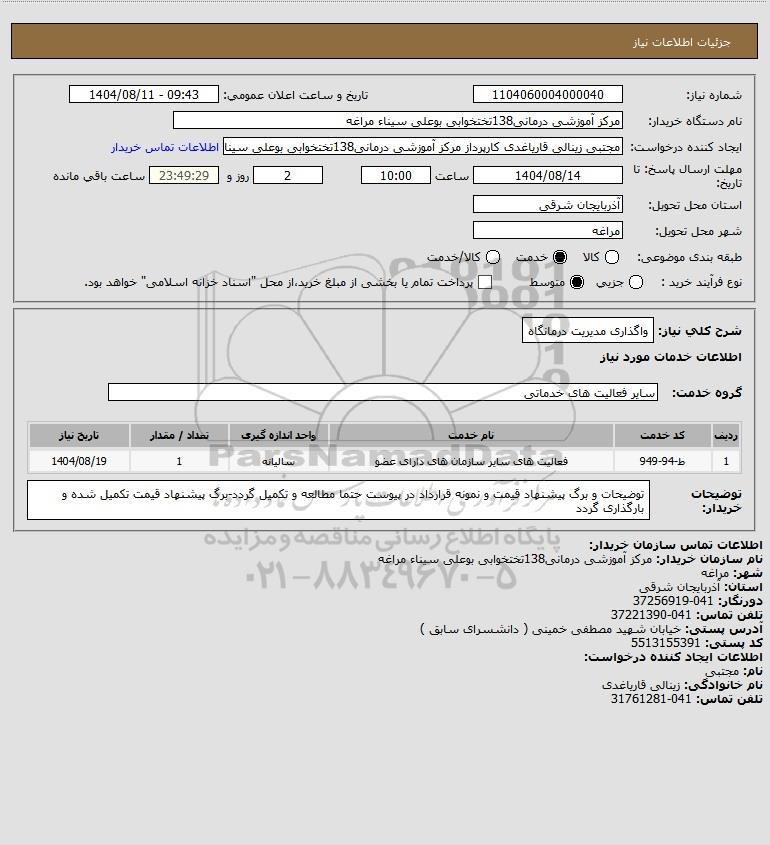 شرح کلی نیاز: واگذاری مدیریت درمانگاه