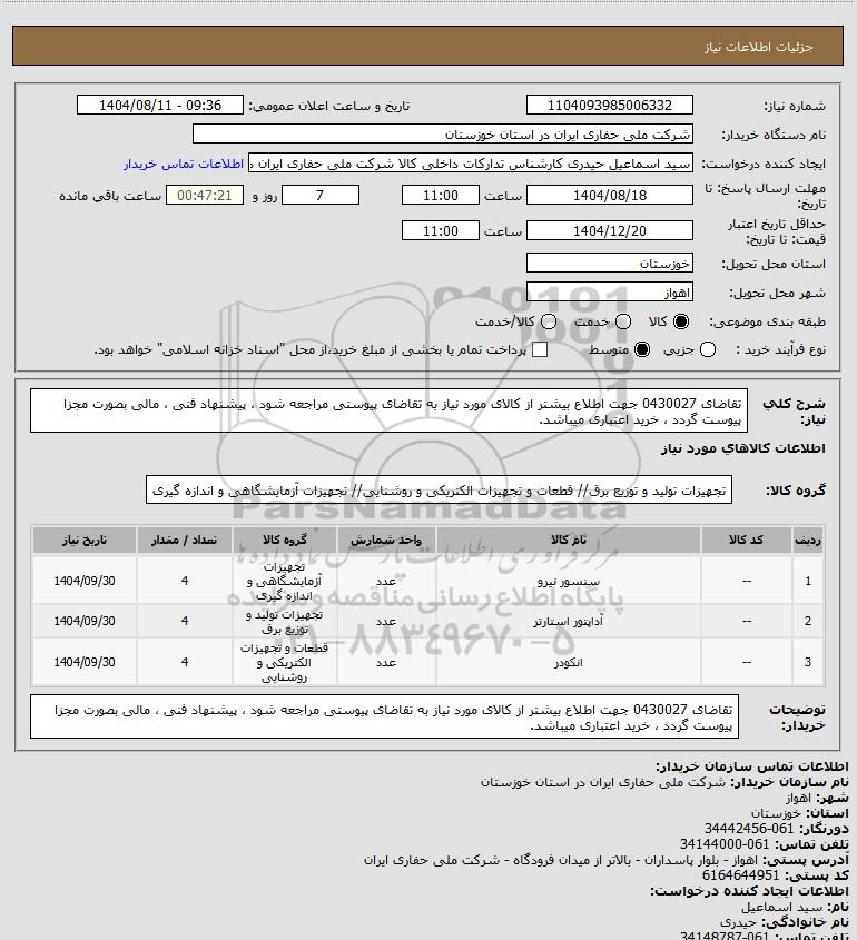 | 2 | -- | آداپتور استارتر | عدد | تجهیزات تولید و توزیع برق | 4 | 1404/09/30 |