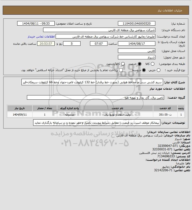 شرح کلی نیاز: سیم کشی سی م محافظ هوایی (بصورت خط برقدار) خط 132 کیلوولت لامرد-جهاد وخط 66 کیلوولت سیمکان-قیر