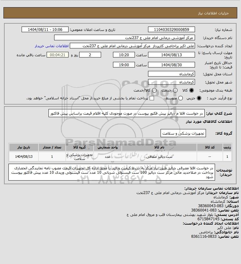 شرح کلی نیاز: در خواست اقلا م دیالیز پیش فکتور پیوست در صورت موجودی کلیه اقلام قیمت براساس پیش فاکتور