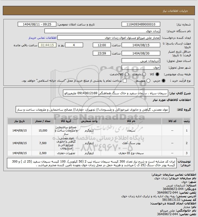 توضیحات خریدار:ایران کد مشابه است و شرح نیاز تعداد 300 کیسه سیمان سیاه تیپ 2 (50 کیلویی)، 100 کیسه سیمان سفید (25 ک ) و 300 کیسه پودر خاک سنگ (25 ک ) میباشد و هزینه حمل در محل زندان خوی بعهده تامین کننده محترم میباشد .
