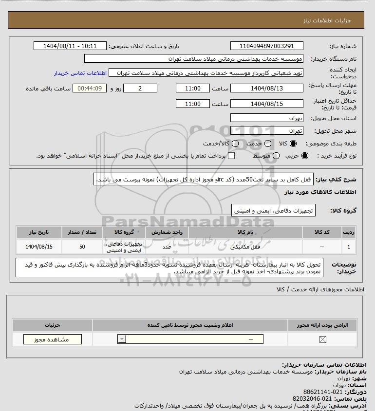 | 1 | -- | قفل مکانیکی | عدد | تجهیزات دفاعی، ایمنی و امنیتی | 50 | 1404/08/15 |