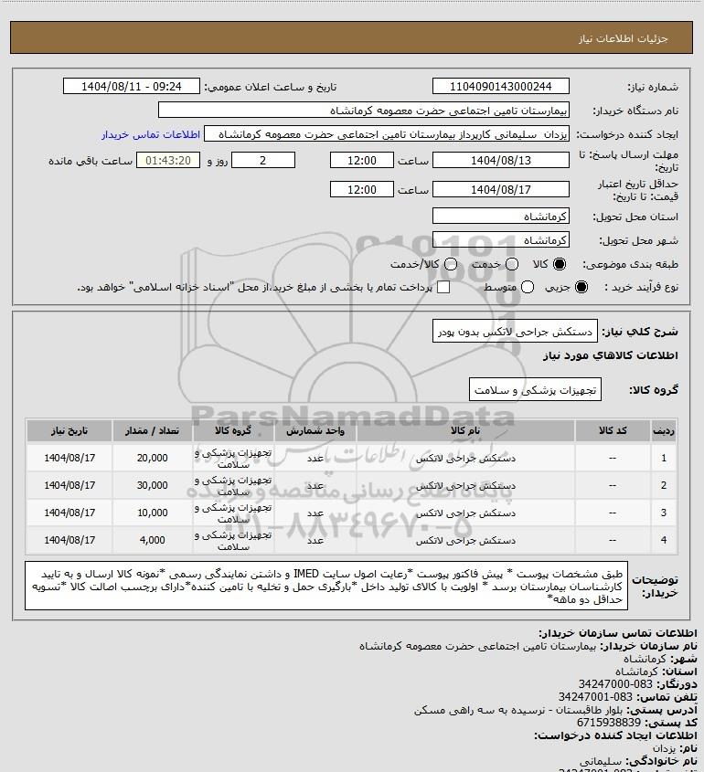3 -- دستکش جراحی لاتکس عدد تجهیزات پزشکی و سلامت 10,000 1404/08/17