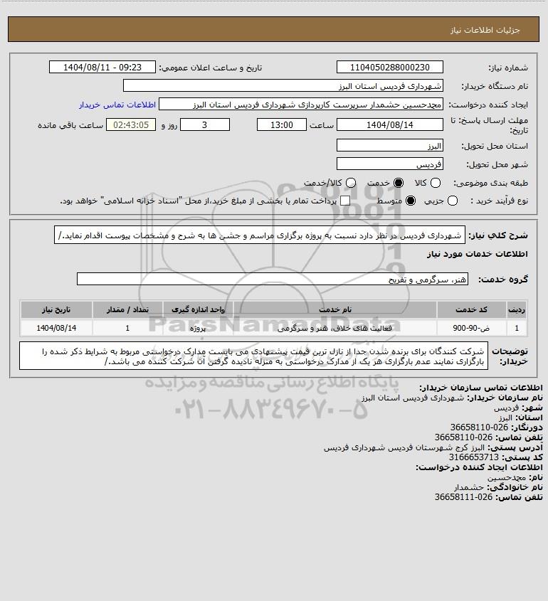 شرح کلی نیاز: شهرداری فردیس در نظر دارد نسبت به پروژه برگزاری مراسم و جشن ها به شرح و مشخصات پیوست اقدام نماید./