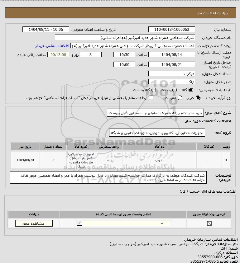 | 1 | -- | مادربرد | عدد | تجهیزات مخابراتی، کامپیوتر، موبایل، ملزومات جانبی و شبکه | 3 | 1404/08/20 |