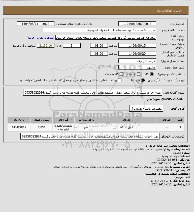 شرح کلی نیاز: تهیه اجرای شبکه و برق شعبه مصلی مشهدمطابق فایل پیوست کلیه هزینه ها با تامین کننده09358522934