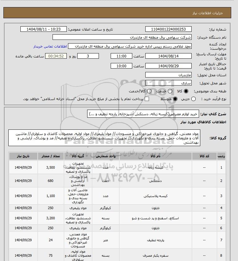| 1 | -- | کیسه زباله | عدد | تجهیزات شستشو، نظافت، پاکسازی و تصفیه | 3,500 | 1404/09/29 |
