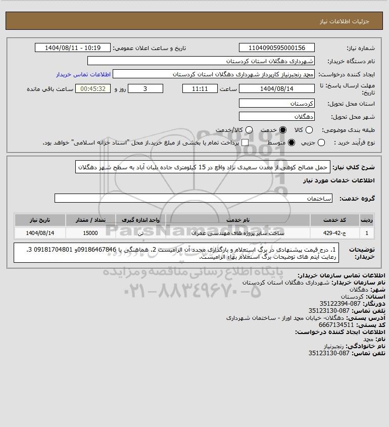 شرح کلی نیاز: حمل مصالح کوهی از معدن سعیدی نژاد واقع در 15 کیلومتری جاده بلبان آباد به سطح شهر دهگلان