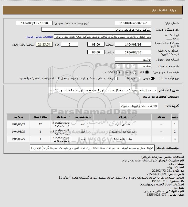 شرح کلی نیاز: ست مبل هفت نفره 1 ست + گل میز عسلی 1 عدد + صندلی ثابت کنفرانسی 12 عدد