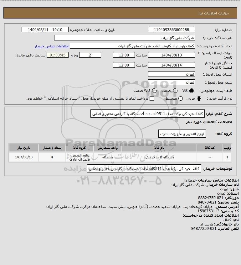 شرح کلی نیاز: کاغذ خرد کن نیکتا مدل sd9511 تداد 4دستگاه با گارانتی معتبر و اصلی