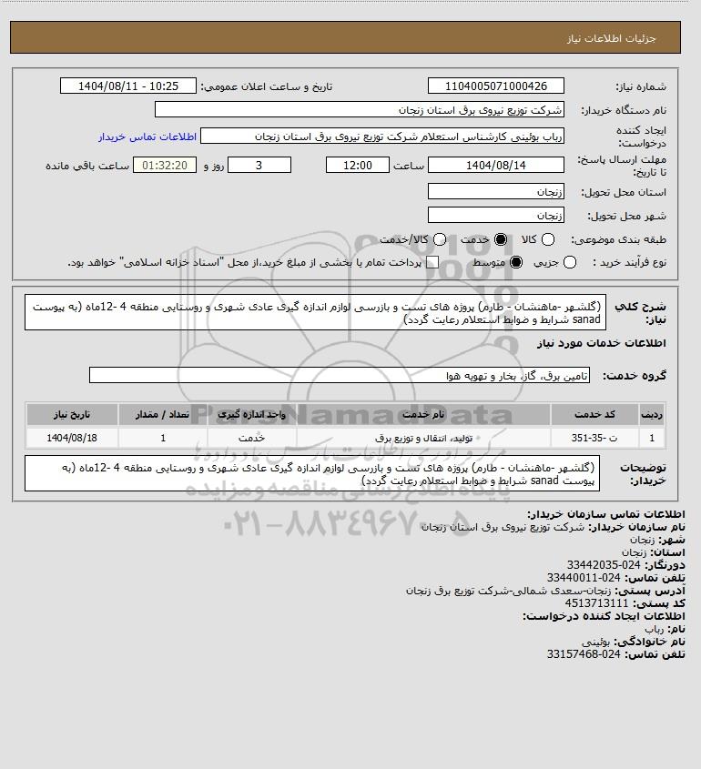 شرح کلی نیاز: (گلشهر -ماهنشان - طارم) پروژه های تست و بازرسی لوازم اندازه گیری عادی شهری و روستایی منطقه 4 -12ماه (به پیوست sanad شرایط و ضوابط استعلام رعایت گردد)