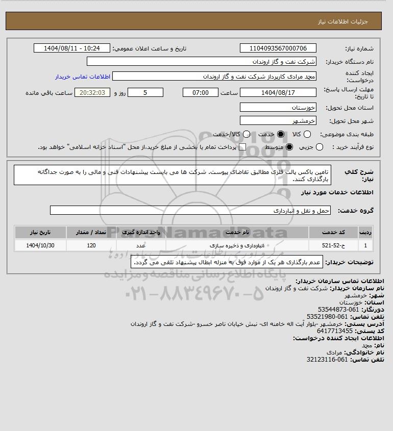 شرح کلی نیاز: تامین باکس پالت فلزی مطالبق تقاضای پیوست. شرکت ها می بایست پیشنهادات فنی و مالی را به صورت جداگانه بارگذاری کنند.