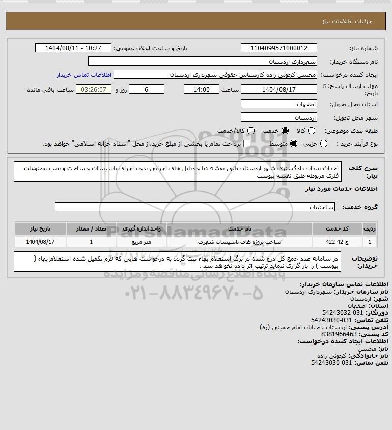 شرح کلی نیاز: احداث میدان دادگستری شهر اردستان طبق نقشه ها و دتایل های اجرایی بدون اجرای تاسیسات و ساخت و نصب مصنوعات فلزی مربوطه طبق نقشه پیوست
