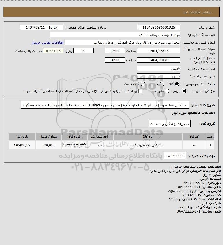 | 1 | -- | دستکش معاینه پزشکی | عدد | تجهیزات پزشکی و سلامت | 200,000 | 1404/08/22 |