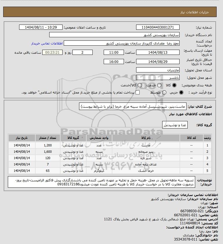 شرح کلی نیاز: ماست،پنیر، شیر،شنیسل آماده سینه مرغ، خرما (برابر با شرایط پیوست)