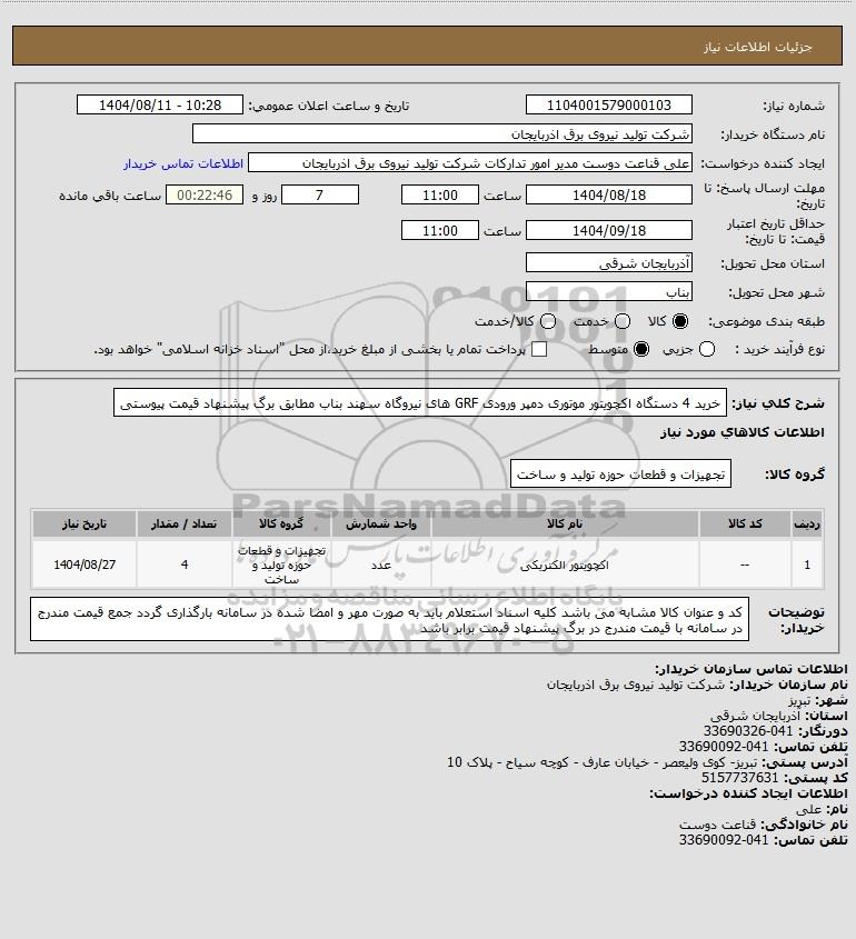 نام دستگاه خریدار:شرکت تولید نیروی برق اذربایجان