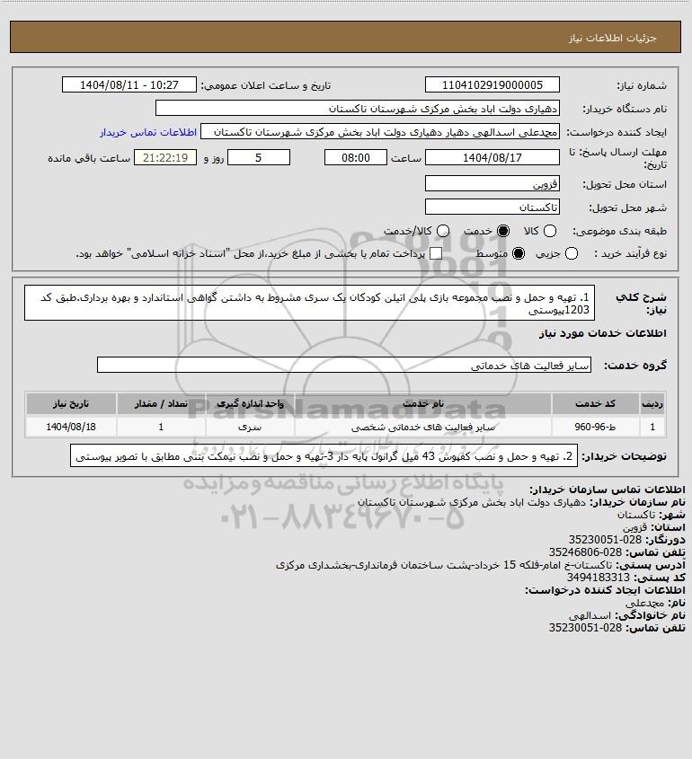 شرح کلی نیاز: 1. تهیه و حمل و نصب مجموعه بازی پلی اتیلن کودکان یک سری مشروط به داشتن گواهی استاندارد و بهره برداری.طبق کد 1203پیوستی