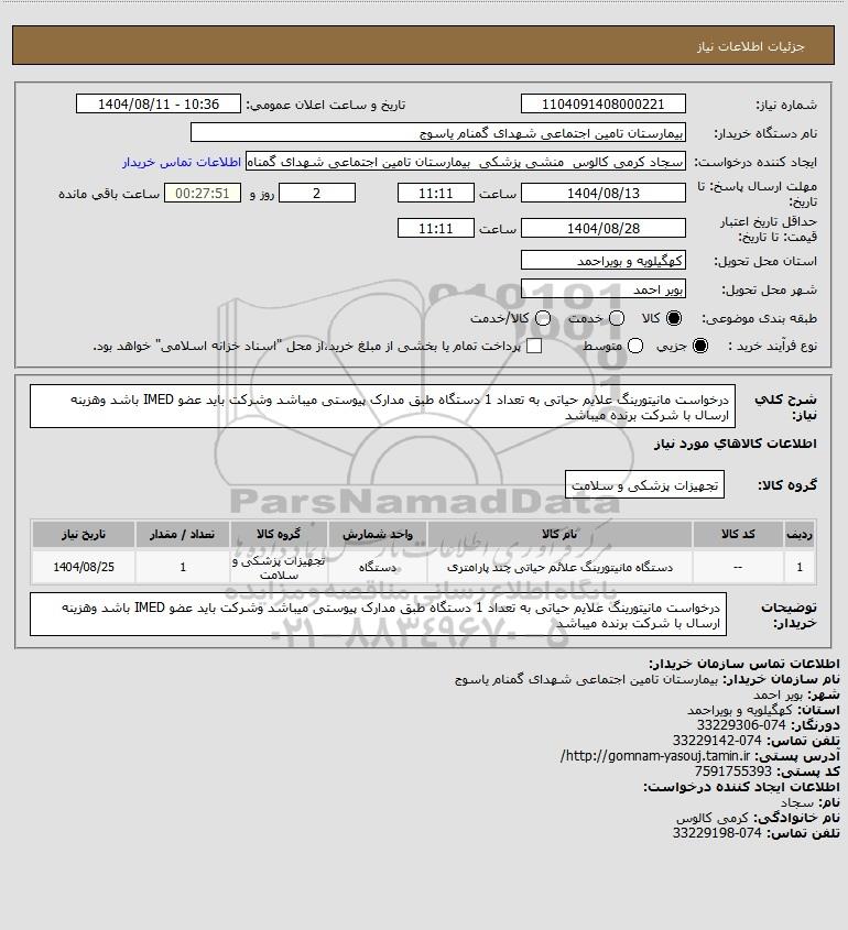 نام دستگاه خریدار:بیمارستان تامین اجتماعی شهدای گمنام یاسوج