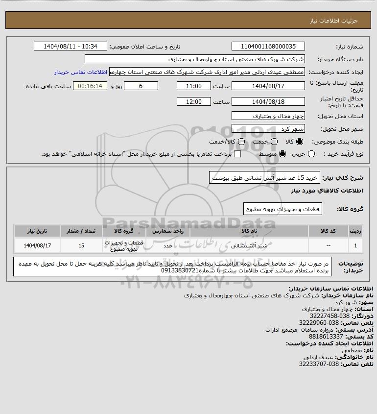 شرح کلی نیاز: خرید 15 عد شیر آتش نشانی طبق پیوست