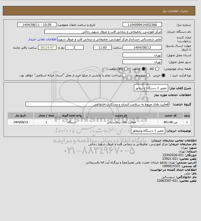 شرح کلی نیاز: تعمیر 1 دستگاه ونتیلاتور
