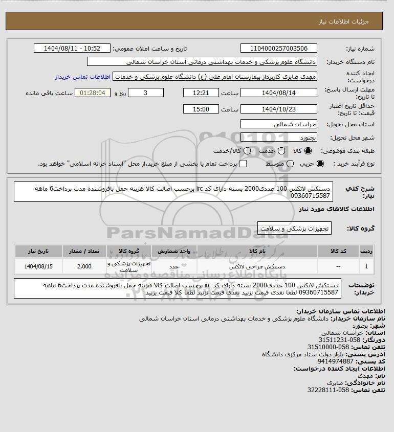 شرح کلی نیاز: دستکش لاتکس 100 عددی2000 بسته دارای کد irc برچسب اصالت کالا هزینه حمل بافروشنده مدت پرداخت6 ماهه 09360715587