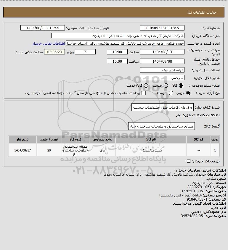 نام دستگاه خریدار:شرکت پالایش گاز شهید هاشمی نژاد استان خراسان رضوی