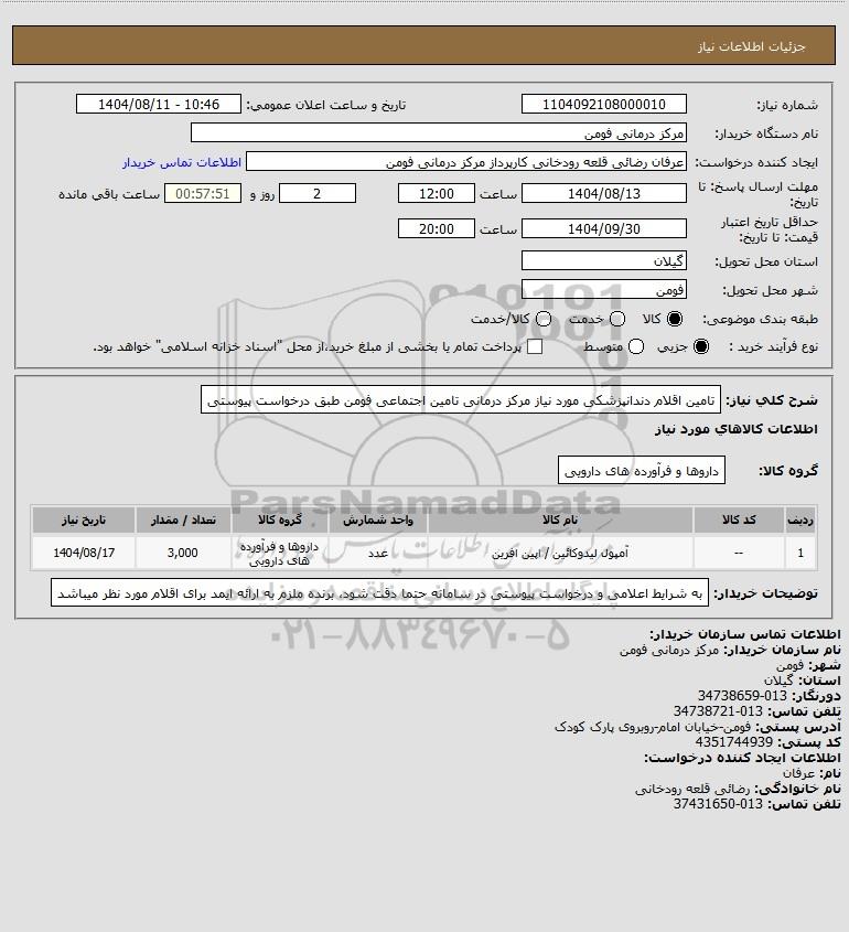 شرح کلی نیاز: تامین اقلام دندانپزشکی مورد نیاز مرکز درمانی تامین اجتماعی فومن طبق درخواست پیوستی