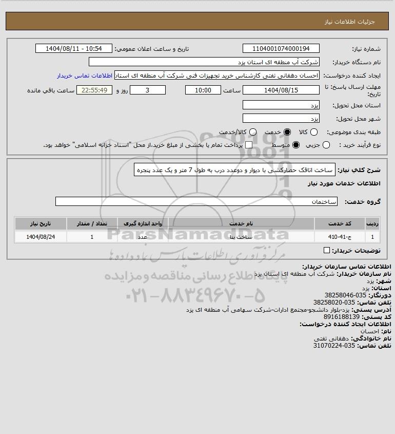 شرح کلی نیاز: ساخت اتاقک حصارکشی با دیوار و دوعدد درب به طول 7 متر و یک عدد پنجره