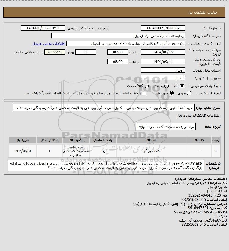 استعلام بها و موضوع استعلام استعلام خرید کاغذ طبق لیست پیوستی ،توجه درصورت تکمیل ننمودن فرم پیوستی به قیمت اعلامی شرکت رسیدگی نخواهدشد. به اطلاع کلیه شرکت‌ها و افراد متخصص واجد شرایط می‌رساند، آگهی گذار در نظر دارد از طریق استعلام بها، نسبت به انتخاب و دریافت پیشنهادات اقدام نماید. این استعلام با کد آگهی ثبت شده در سامانه خبرگزاری پارس نماد : 9786594 منتشر شده است. مشخصات استعلام : تاریخ شروع استعلام: 1404/08/11 آخرین مهلت ارسال پیشنهاد قیمت : 1404/08/15 و محل اجرای پروژه : استان اردبیل میباشد. استعلام قیمت مورد درخواست : استعلام خرید کاغذ طبق لیست پیوستی ،توجه درصورت تکمیل ننمودن فرم پیوستی به قیمت اعلامی شرکت رسیدگی نخواهدشد. با دسته‌بندی‌های تخصصی و گروه های مرتبط : نوشت افزار, کاغذ و فرم پیوست, ماشین اداری, استعلام اطلاع رسانی میگردد.