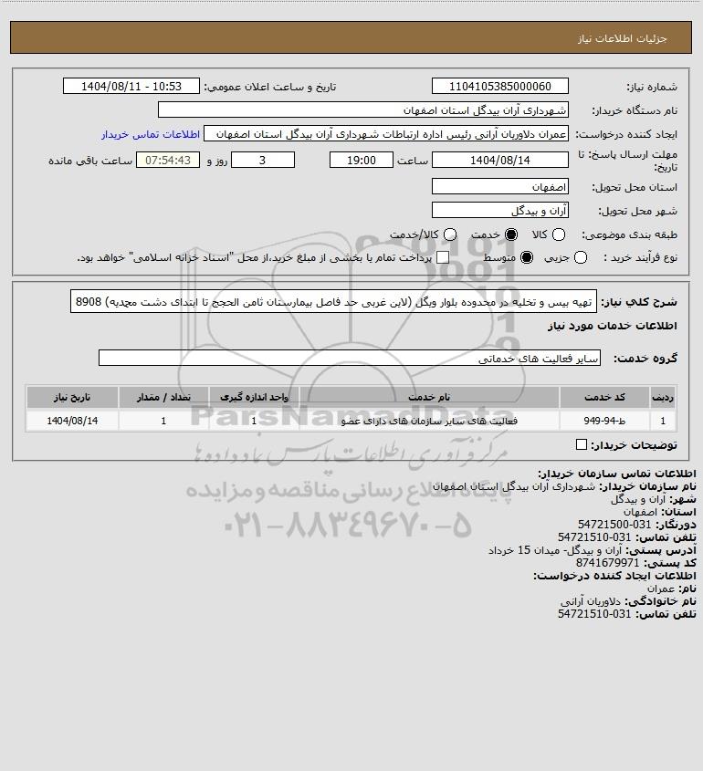 شرح کلی نیاز: تهیه بیس و تخلیه در محدوده بلوار ویگل (لاین غربی حد فاصل بیمارستان ثامن الحجج تا ابتدای دشت محمدیه) 8908